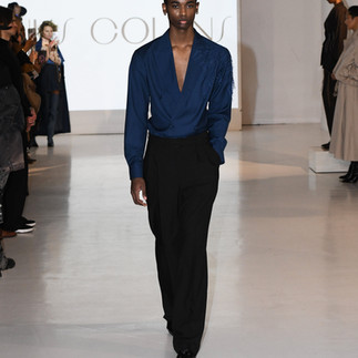 Drawing from African textile traditions, tribal markings, and classical tailoring, the collection translates ancestral codes into sculptural outerwear, modular constructions, and adaptive silhouettes. Hand-finished jacquards evoke botanical forms that feel simultaneously organic and digital, as though nature itself has been interpreted through a futuristic algorithm. Each piece becomes a narrative in motion, a dialogue between history and innovation. Material exploration reinforces this philosophy. Regenerative fabrics, bio-leather, and coated wools signal that sustainability is not a fleeting trend but a responsibility. In Collins’ world, luxury is measured not by novelty alone, but by intention, endurance, and the ability to resonate across generations. Craftsmanship becomes a vessel for cultural memory - a way to preserve knowledge while creating garments designed to outlast the ephemera of seasonal fashion.